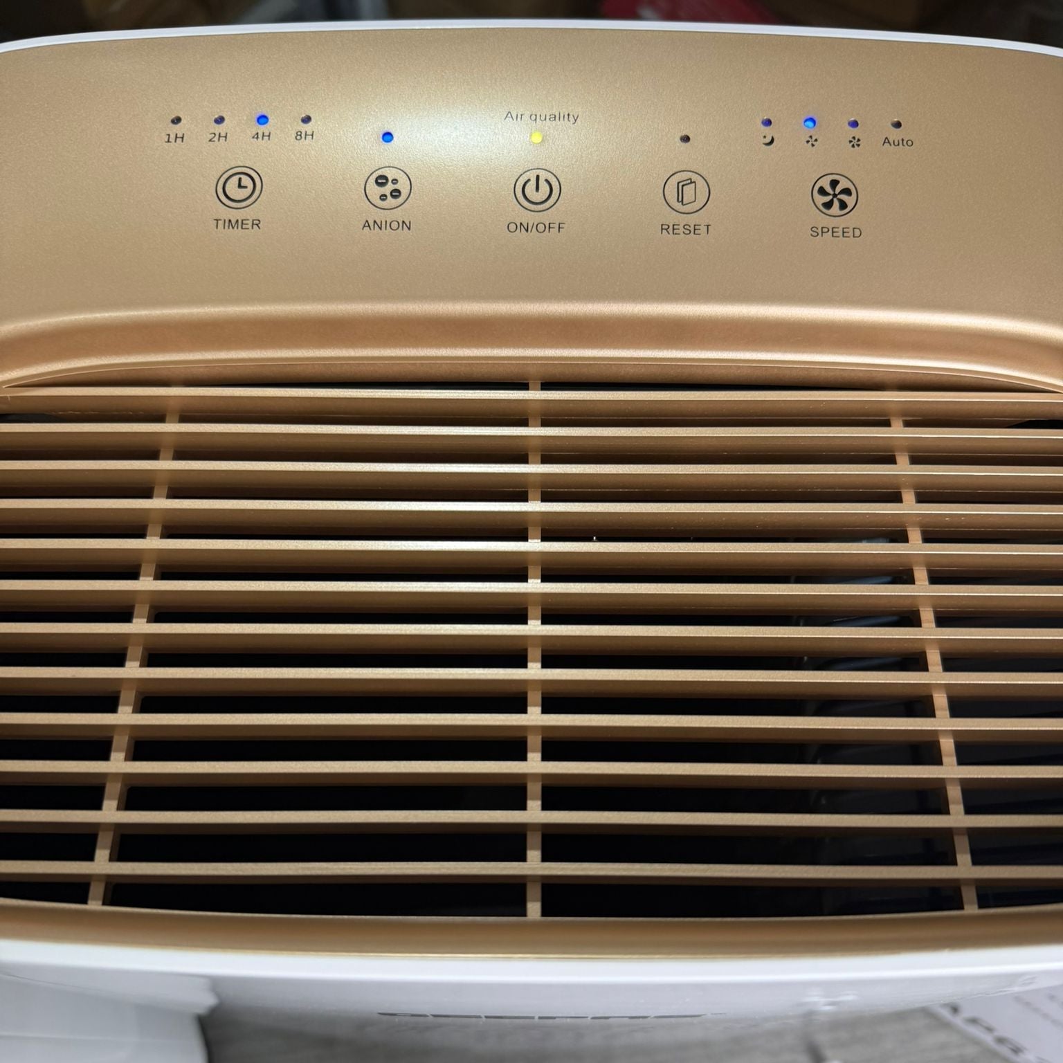 Air purifier with 4-stage filtration: pre-filter for dust & hair, True HEPA H13 capturing 99.97% particles (0.3 µm), activated carbon filter for smoke & odors, plus built-in ionizer — for clean, fresh air all day.