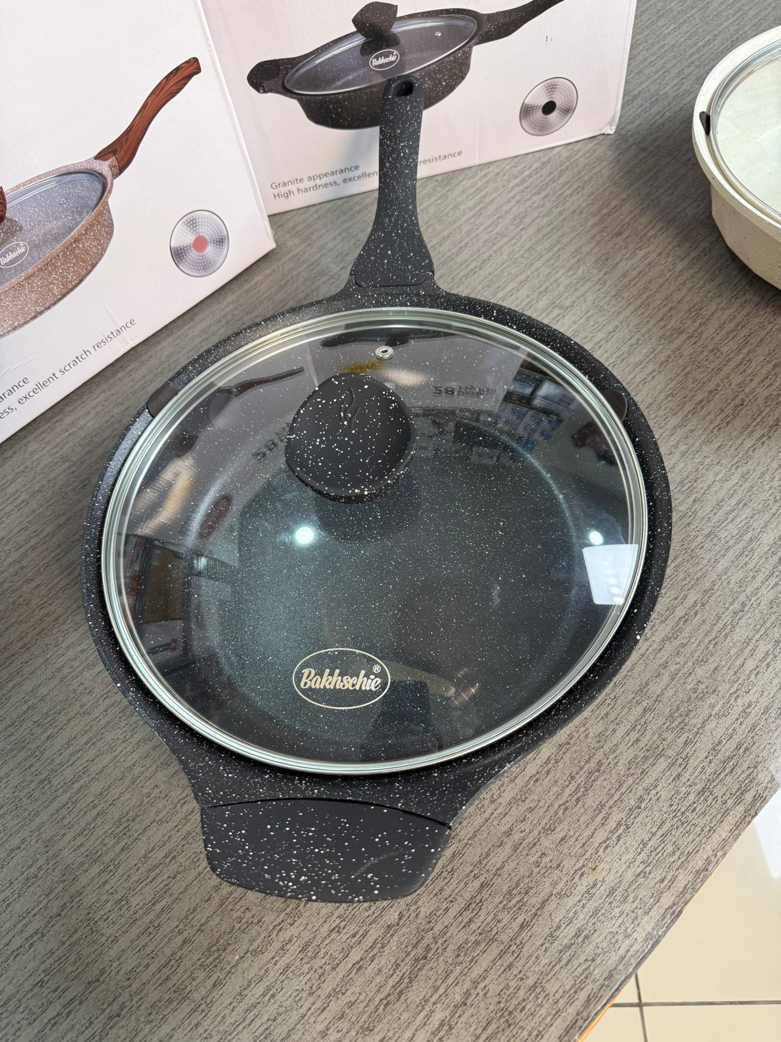 German Lot Bakhshie 28cm Deep Fry Pan with Glass Lid & Wooden Handles | Granite Non-Stick Cookware